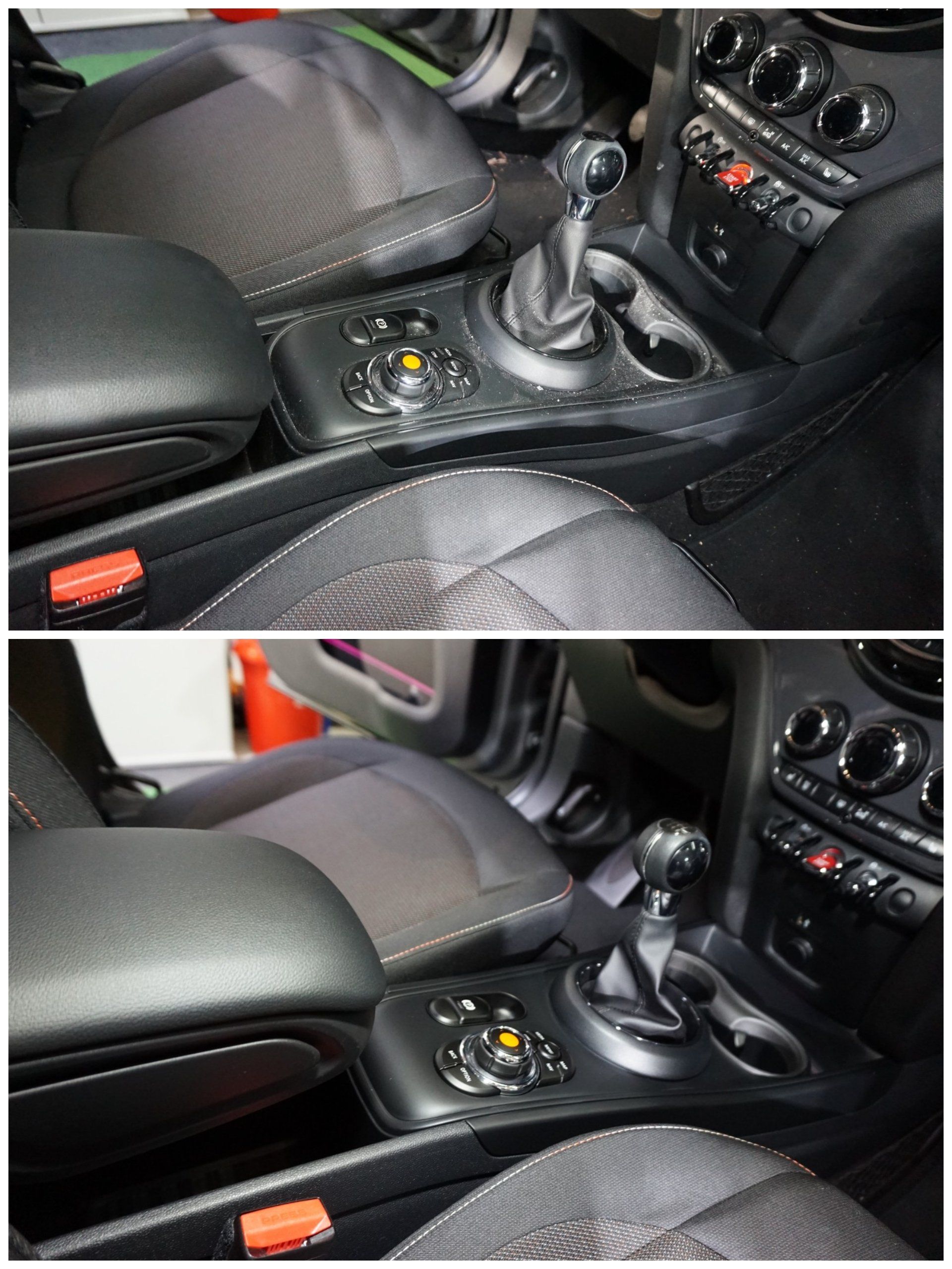 Wie beim äußeren des Fahrzeugs bekommt auch der Innenraum nach der Reinigung eine Pflege in Form von spezieller Kunststoffpflege für den Interieur Bereich. Neben einer satten Farbauffrischung der Kunststoffe schützt die Pflege auch vor UV Strahlung und unterbindet für einige Zeit erneutes vergrauen der Armaturen durch die Sonneneinstrahlung. Zur Ansicht wurden in den Bildern Teilbereiche abgeklebt um den Unterschied auf bereits gereinigten Teilen hervorzuheben.