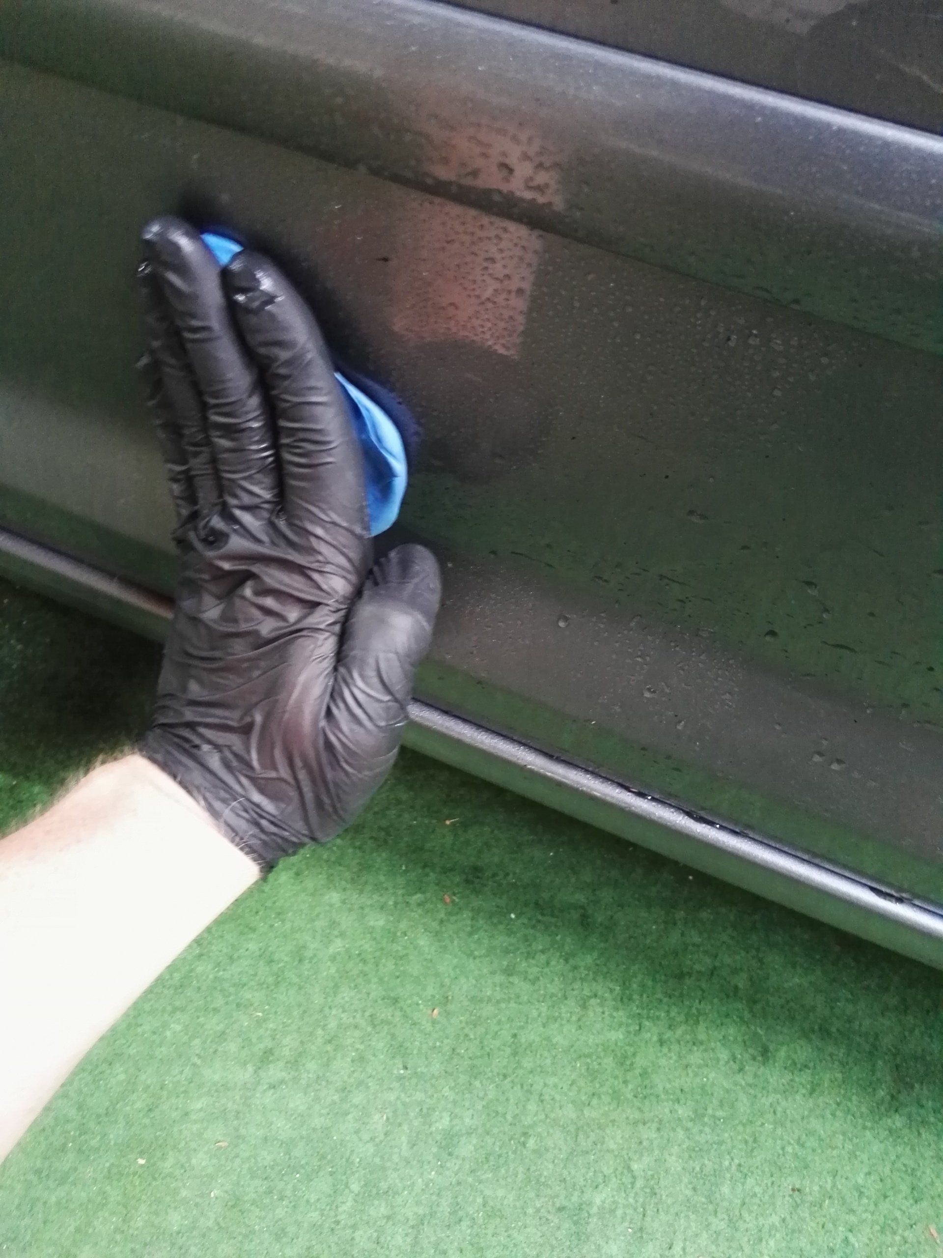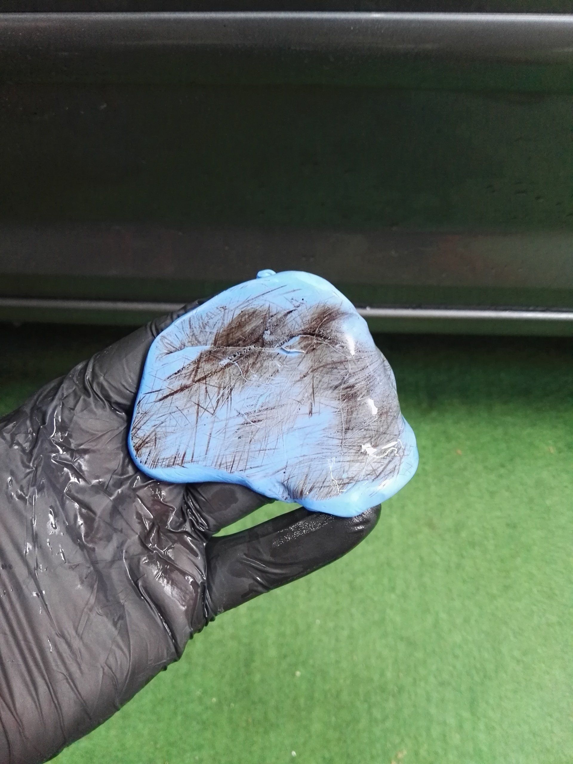 Allen Lackpflegepaketen geht vor dem eigentlichen polieren die gleiche Vorarbeit voraus. Nach einer gründlichen Wäsche des Fahrzeugs samt Einstiegen, Kofferraumfalz, Felgen und sonstigen "Drecknestern" geht es damit los den Lack von allen weiteren Anhaftungen zu befreien die sich im Zuge einer Reinigung alleine nicht entfernen lassen. Mit einer speziellen Knete und dafür vorgesehenen Gleitmittel wird die gesamte Lackfläche des Fahrzeugs gründlich bearbeitet um z.B. Insektenreste, Baumharz oder Flugrost vor dem polieren vom Lack zu entfernen. In diesem extremen Beispiel erkennt man wie viel noch an dem Fahrzeug haftet obwohl es vorher bereits gründlichst gewaschen wurde. Der Schmutz in der Knete stammt alleine vom unteren Teil der Fahrertür. Diesen Schmutz würde man ohne diesen Zwischenschritt beim Poliervorgang auf dem Fahrzeug verteilen und sich dadurch gleich wieder neue Spuren in den Klarlack ziehen.