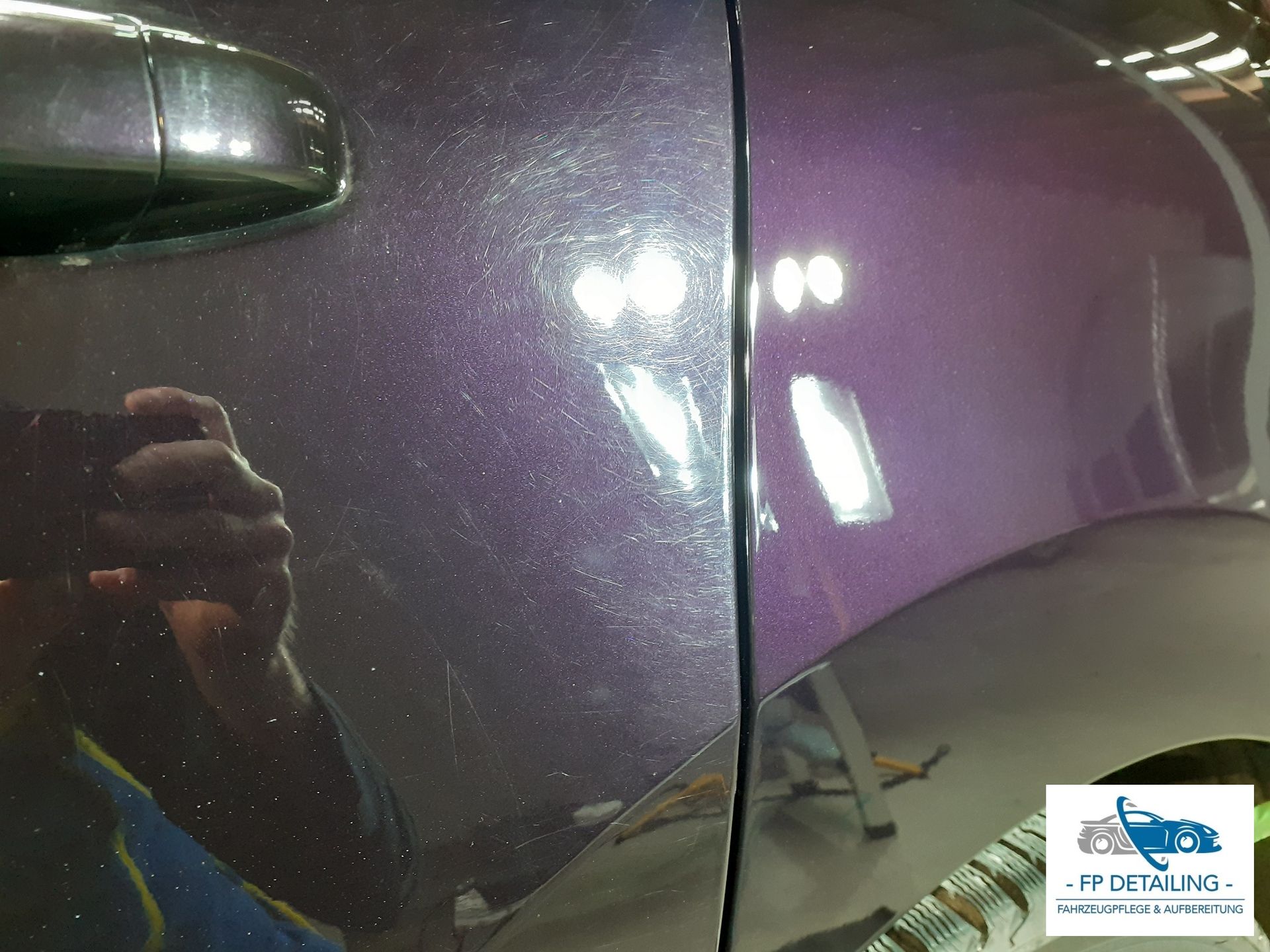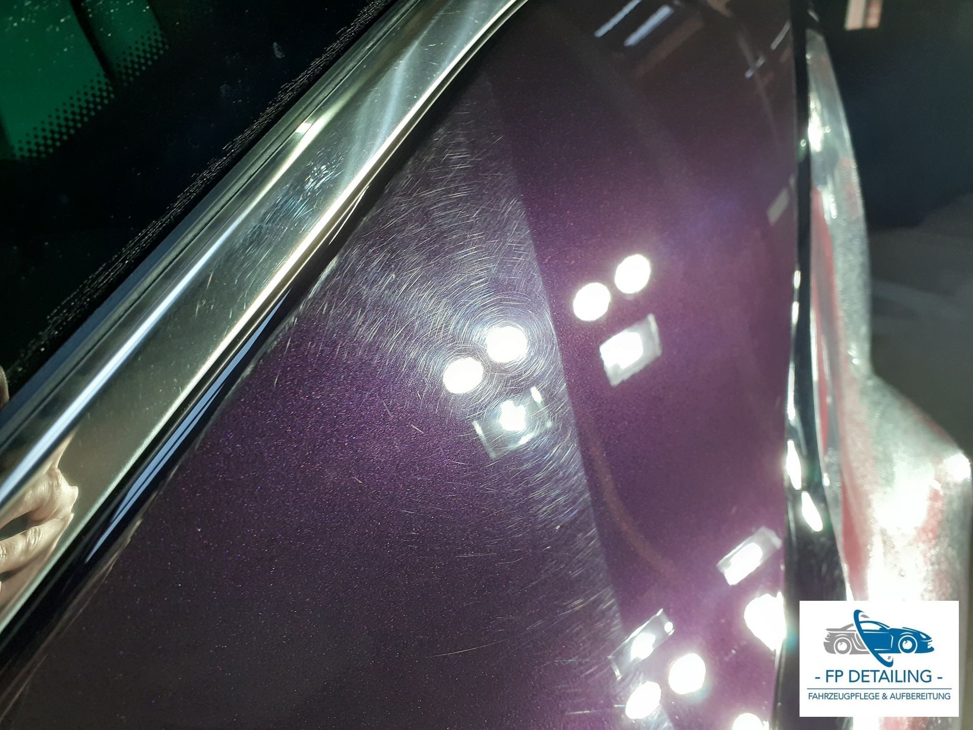 Wenn Sie ein Paket mit einem mehrstufigen Polierdurchgang gewählt haben wird dieser Kompromiss umgangen. Im ersten Durchgang wird der Wagen mit einer stärker abrasiven Politur poliert um möglichst viele Kratzer zu entfernen und eine gute Ausgangsgrundlage zu schaffen. Im nächsten Durchgang wird mit Hilfe einer Hochglanzpolitur das Finish erarbeitet um einen möglichst hohen Glanzgrad zu erreichen. Diese Kombination bringt Ihnen den Tiefenglanz der Ihr Fahrzeug im wahrsten Sinne des Wortes erstrahlen lässt. Im Anschluss ein paar Bilder von verschiedenen Polierarbeiten. Beim Blick auf die spiegelnden Lichtquellen im Bild lässt sich sehr gut der Unterschied der polierten und unpolierten Flächen erkennen.